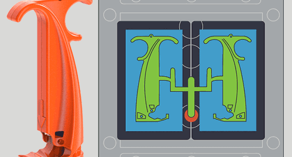 Das Beispiel zeigt eine Familienform, die zur Herstellung des abgebildeten Teils verwendet wurde. Es handelt sich dabei um eine Komponente des SubQ It, ein medizinisches Werkzeug, das zum Verschließen von chirurgischen Inzisionen mit bioresorbierbaren Befestigungselementen verwendet wird.