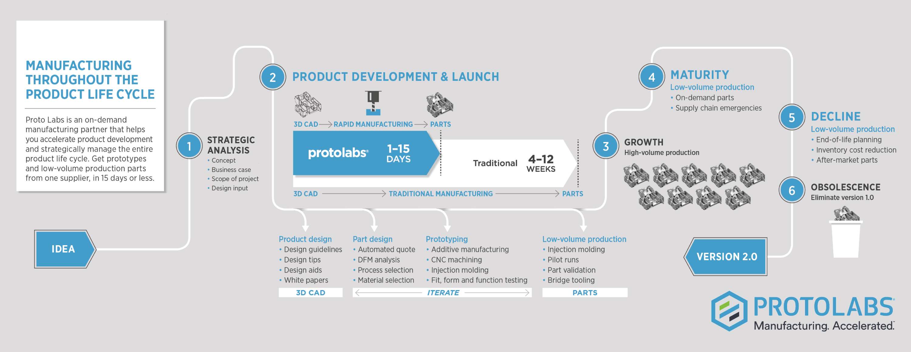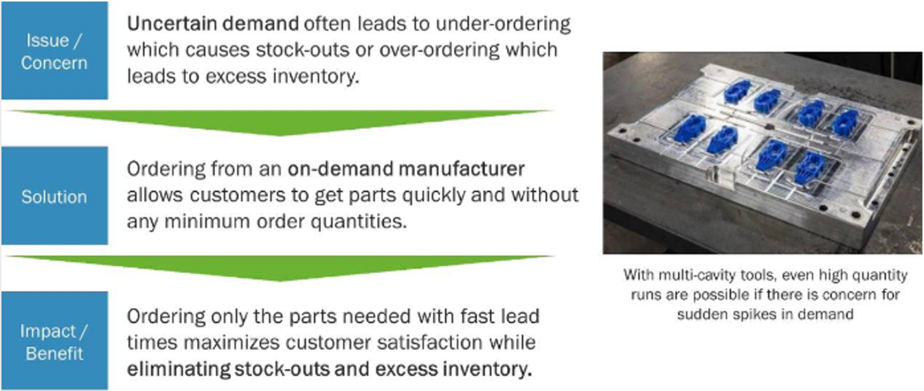 The move to serial production raises fresh issues for an intelligent prototyping strategy to consider. One key consideration, for instance, revolves around how quickly a given part or product will transition to serial production—in the case of parts or products that are in effect simply a new iteration of an existing proven design or product, the time spent in the low-volume phase of product evolution could be minimal or a way to adopt on-demand production allowing continual product development throughout the product lifecycle.
