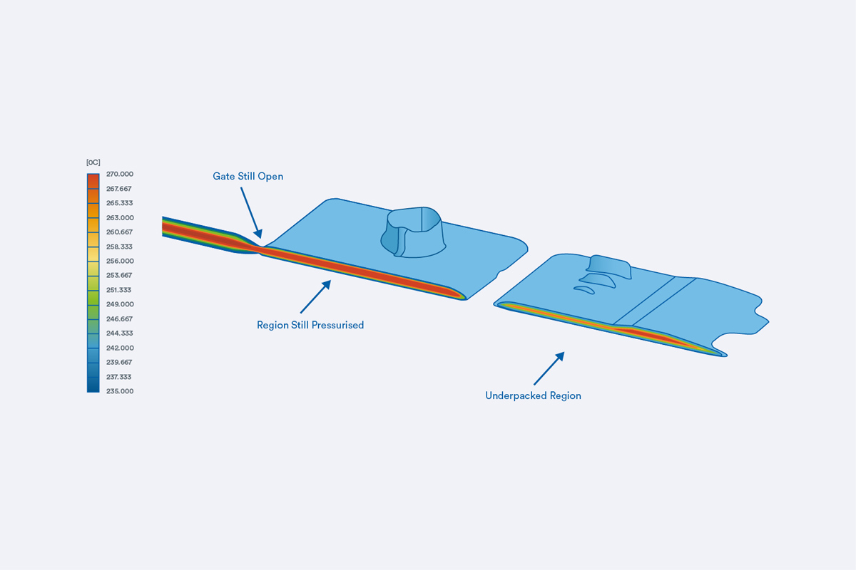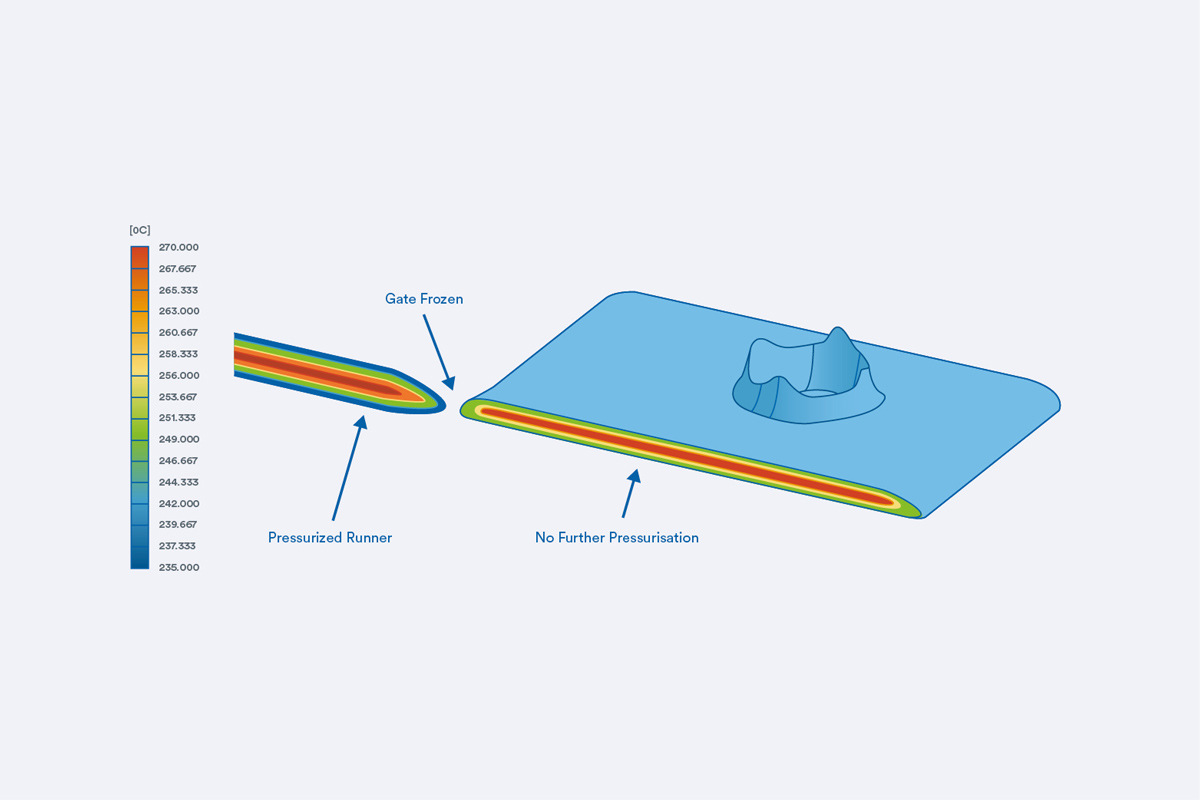 鉴于浇口通常比零件壁薄,浇口会在零件几何形状之前凝固。一旦浇口凝固,来自进料系统的零件腔的增压就完成了。