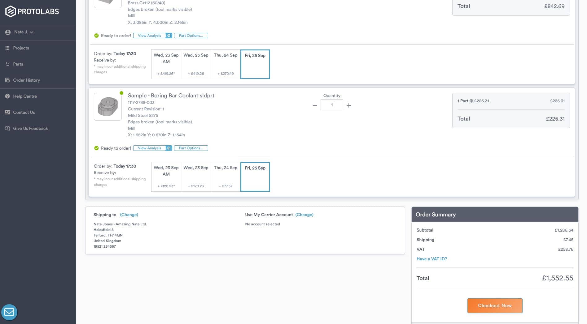 Quando il design dei pezzi è ottimizzato e le eventuali modifiche apportate, e il prezzo e i dettagli della spedizione sono in ordine, non dovete fare altro che selezionare l’opzione ACQUISTA ORA nella pagina VERIFICA E ORDINA. Inserite le informazioni per la spedizione (aggiungendo il numero di riferimento, l'indirizzo Drop Ship, i documenti per l’esportazione) e quelle per la fatturazione (pagamento con carta di credito o ordine di acquisto), confermate i dettagli e selezionate COMPLETA L’ORDINE. A seconda della data di spedizione richiesta, i pezzi possono essere spediti anche in sole 24 ore. Li potrete ispezionare personalmente poco dopo.