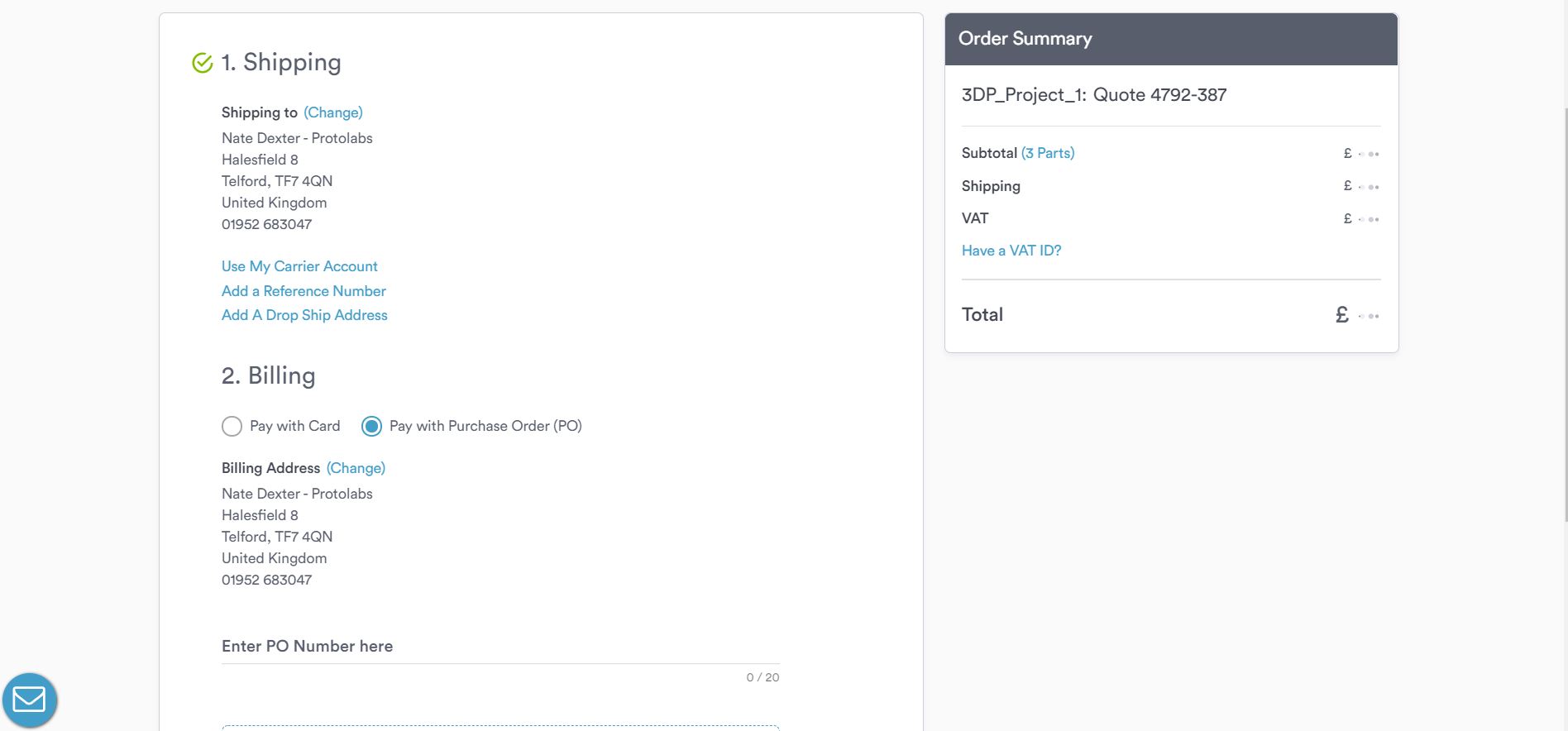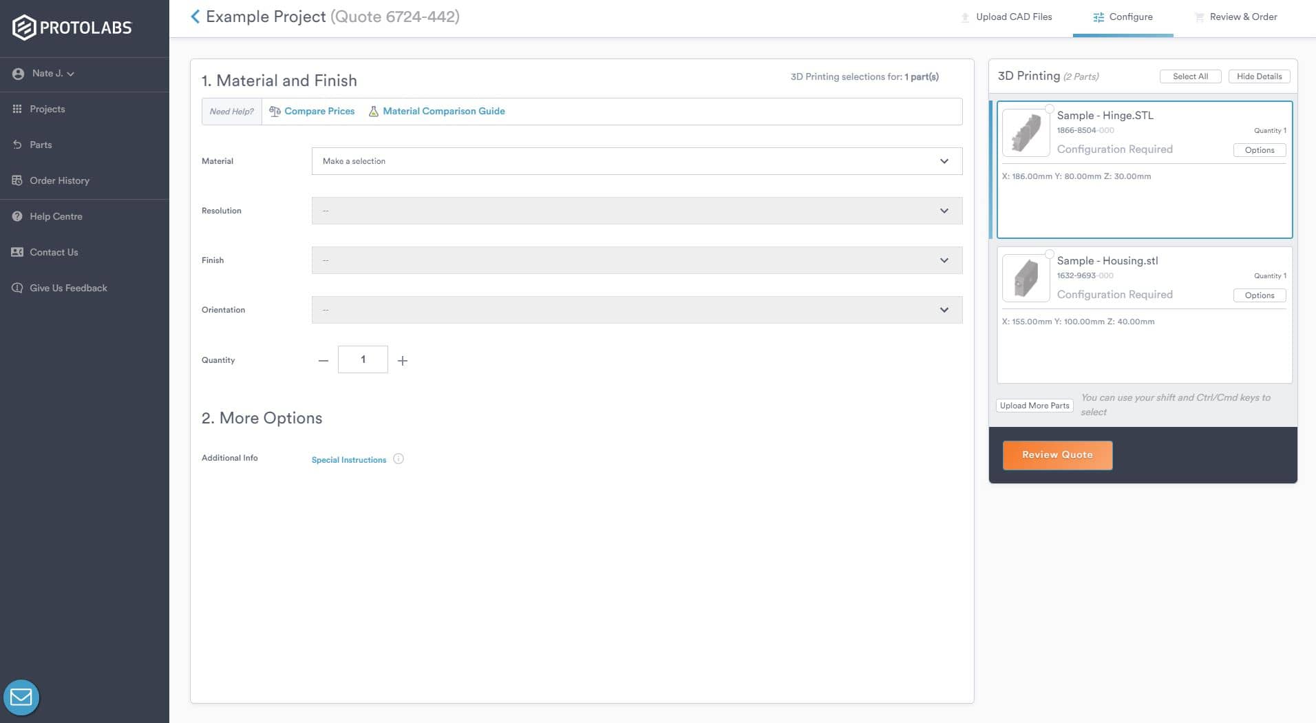 Nella configurazione del preventivo sono presenti numerosi elementi che velocizzano e semplificano il processo. Ad esempio, ora è possibile rinominare i pezzi man mano che passate da una revisione del design all’altra. Questo è un dettaglio utile nella gestione del vostro progetto, poiché in precedenza la ridenominazione dei pezzi poteva essere effettuata solo su richiesta. Inoltre, se un progetto contiene diversi preventivi di pezzi e uno di questi blocca l'ordine, è possibile rimuovere il pezzo in questione e creare un ordine distinto. Questo aiuta a garantire che tutti i pezzi siano creati e spediti il più rapidamente possibile, utilizzando la funzionalità di preventivo in lotti.