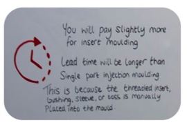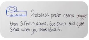 Come ho già detto, la maggior parte dei fornitori caricherà probabilmente a mano l’inserto nello stampo. E poiché di solito gli stampi sono piuttosto caldi, l’operatore indosserà dei guanti. Sapete bene quanto sia difficile maneggiare con i guanti oggetti di piccole dimensioni: per questo motivo, il fornitore indicherà le dimensioni minime che gli inserti dovranno rispettare. In Protolabs, per esempio, preferiamo lavorare con inserti le cui dimensioni siano superiori a 3,17 mm di diametro, anche se si tratta sempre di dimensioni molto piccole, se ci pensate bene.