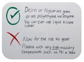 Esaminiamo ora quali tipi di materiali termoplastici potete usare per il costampaggio. Le plastiche rigide per uso industriale come il Delrin o il PA (nylon) vanno benissimo, così come il polietilene e l’etilene. Potete persino usare la gomma siliconica liquida.