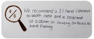 Inoltre, nessun inserto dovrebbe essere posizionato troppo in profondità nello stampo; consigliamo un rapporto di 2:1 tra lo spazio libero (per consentire il passaggio della mano dell’operatore) e la profondità dell’inserto.