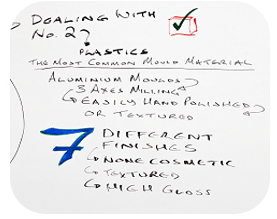 La finitura dipenderà dallo stampo. Gli stampi in alluminio vengono realizzati con la fresatura a tre assi e sono facilmente lucidati a mano o goffrati per ottenere sette finiture diverse che spaziano dalla superficie non estetica o goffrata a quella lucidata, molto brillante.
