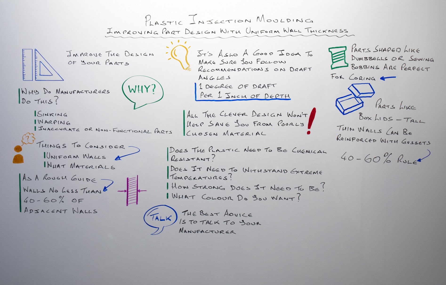 Per comprenderne il funzionamento nella pratica, munitevi di un qualsiasi prodotto di uso comune realizzato in plastica, come un portaspazzolino da denti o uno scolapiatti. Osservatelo bene e noterete che sebbene il design abbia molte curve e spigoli, le pareti hanno quasi sicuramente uno spessore abbastanza uniforme.