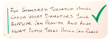 Per riassumere, ricordatevi di verificare il diametro e la profondità che il vostro fornitore è in grado di offrire per i fori filettati standard.