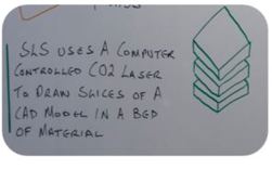 A differenza della natura, per realizzare il pezzo la SLS si avvale di un fascio laser CO2 controllato da computer per “disegnare” fette di un modello CAD in un letto di materiale in polvere fondendo particelle delle dimensioni di micron, uno strato alla volta.