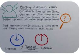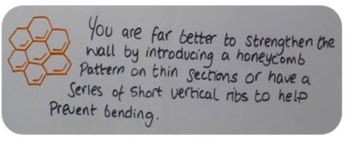 È molto meglio rafforzare la parete introducendo un motivo reticolare sulle sezioni più sottili o una serie di nervature verticali corte per evitare che si pieghi.
