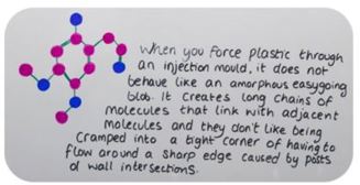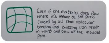 Quando iniettate la plastica in uno stampo, non si comporta come un corpo amorfo resiliente, Anzi, crea lunghe catene di molecole che si legano alle molecole adiacenti ed oppongono resistenza all’essere ammassate in un angolo stretto o al dover fluire attorno ad uno spigolo vivo formato da montanti o intersezioni di pareti.