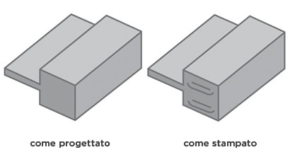 Lo spessore delle pareti è molto importante. Immagina di progettare una semplice scatola. A una prima occhiata, delle pareti spesse potrebbero sembrare un buon metodo per tenere al sicuro il contenuto, ma i materiali plastici usati per lo stampaggio ad iniezione sono... di plastica. Le pareti più spesse di quanto non sia consigliabile per le resine termoplastiche usate, saranno soggette a deformazione e depressione durante il raffreddamento. In linea generale, lo spessore ideale è compreso tra 1 e 3,5 mm e deve rimanere costante in tutti i punti del pezzo.