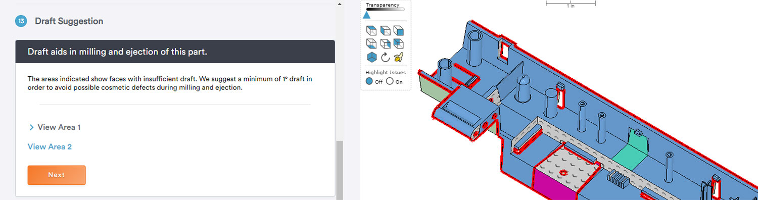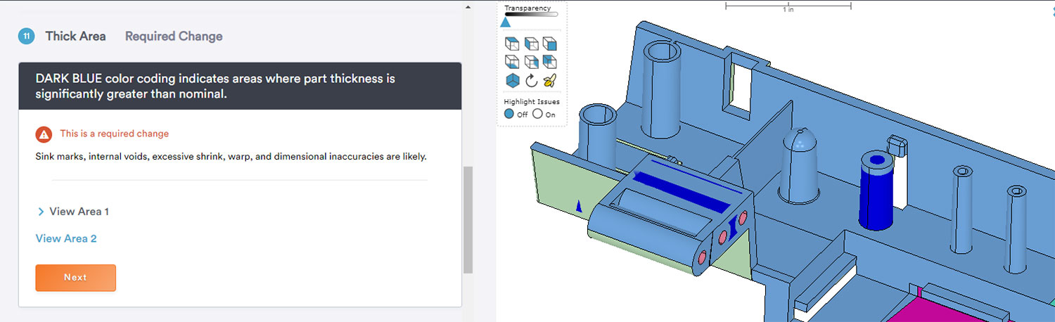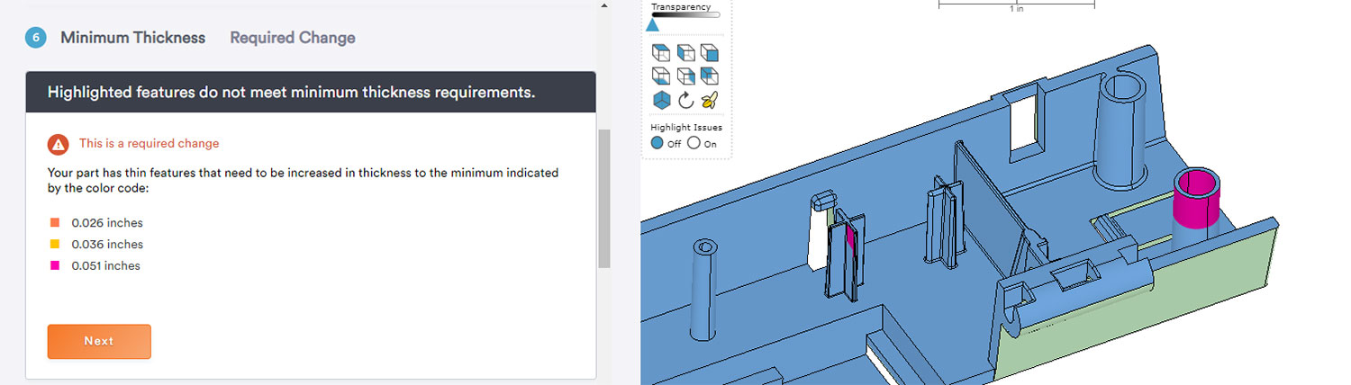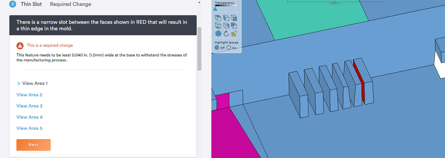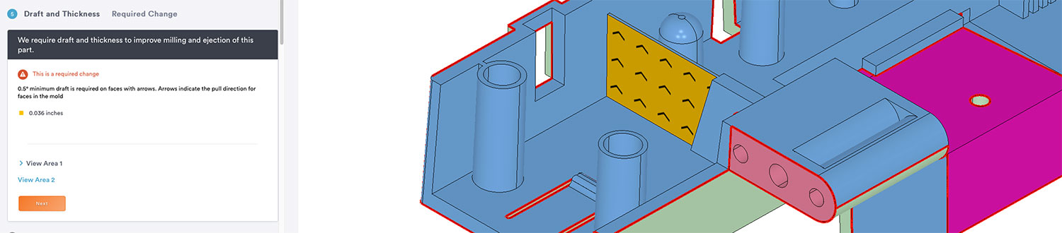 Il nostro avanzato sistema di preventivazione con DFM (Design For Manufacturing) fornisce feedback e avvertenze su tutti i progetti inviati. Ma cosa succede se l'analisi di fattibilità indica la necessità di una riprogettazione correttiva del pezzo? Niente paura! Tali avvertenze includono le informazioni necessarie per creare insieme pezzi di alta qualità, in modo preciso e veloce. In questo suggerimento di progettazione troverete maggiori informazioni su alcune delle avvertenze più comuni, perché possiate intervenire prima che lo stampo venga realizzato e la produzione avviata.