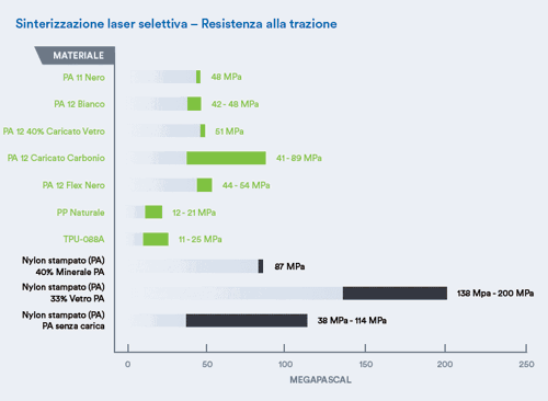 在一般情况下,le PA SLS, se对抗的价值在中间,在控制的力量中,没有价值的HDT,在proprietà meccaniche相似的价值。在pochi casi, le PA SLS riportano proprietà che documentano il grado di anisotropismo。Per un visivo delle proprietà dei materiali SLS, vedi Grafico 4 Per l'inflessione del calore, Grafico 5 Per l'allungamento a rottura e Grafico 6 Per la resistenza真主安拉trzione。
