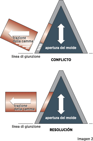 米algrado la relativa semplicità degli azionamenti laterali, quando si utilizza questa soluzione è bene tenere conto di un paio di aspetti. Per prima cosa, gli azionamenti laterali devono muoversi perpendicolarmente rispetto alla direzione di apertura dello stampo. Ciò non sarebbe complicato se le pareti del pezzo non dovessero essere angolate e fossero sempre progettate verticalmente. Le pareti, però, non sempre hanno una pendenza così comoda, perciò si deve fare in modo che gli azionamenti laterali agiscano (e siano essi stessi angolati) perpendicolarmente rispetto alla direzione di apertura dello stampo e non necessariamente rispetto alle superfici su cui si trovano.