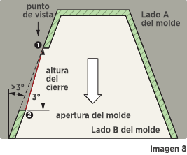 Abbiamo mostrato che, eliminando una “soglia”, è possibile fare a meno degli azionamenti laterali, ma vi sono anche casi in cui un foro di passaggio completamente racchiuso (ad esempio, una finestra) può essere prodotto usando le chiusure scorrevoli. Questo elemento si ottiene sfruttando il vantaggio di un angolo di spoglia, su una parete, più grande del normale, per cui ogni semistampo forma una parte di finestra. La finestra nella Figura 7 è creata applicando le chiusure scorrevoli illustrate nella Figura 8. In questo caso, la chiusura tra i due semistampi si trova a un certo angolo rispetto alla finestra. Il margine superiore della finestra è formato dal semistampo B, mentre il margine inferiore è formato dal semistampo A. I due semistampi devono avere un angolo di spoglia di almeno 3° nel punto in cui si chiudono (chiusure scorrevoli), perciò la parete del pezzo deve avere un angolo di spoglia maggiore di 3°. Il valore aggiuntivo di angolo di spoglia da applicare alla parete dipende dalla geometria del pezzo.