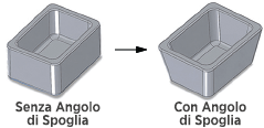 L’uso dell’angolo di spoglia (l’inclinazione delle pareti verticali) ovunque sia possibile è vivamente consigliato, poiché facilita l’espulsione dei pezzi senza impronte di tiratura o fori prodotti dalle punte degli espulsori. I pezzi risultano migliori e vengono prodotti più velocemente.
