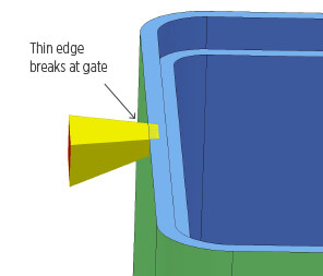 I bordi sottili ostacolano il flusso e possono rompersi durante il taglio dei punti di iniezione. Il punto di iniezione deve trovarsi in corrispondenza di una parete spessa. Può darsi che vi siano soluzioni alternative. Contattate uno dei nostri tecnici del servizio di assistenza clienti al numero +39 0321 381 224 o all’indirizzo[email protected].