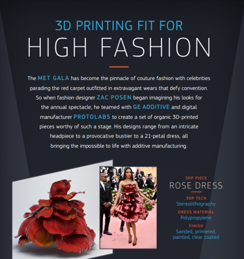 The garments and accessories, worn at the annual fundraising event for theMetropolitan Museum of Artin New York, were the result of an uncommon collaboration by noted designerZac Posen,GE Additive, andProtolabs. The fashions were worn by British supermodel Jourdan Dunn, and actresses Nina Dobrev, Katie Holmes, Julia Garner, and Deepika Padukone.