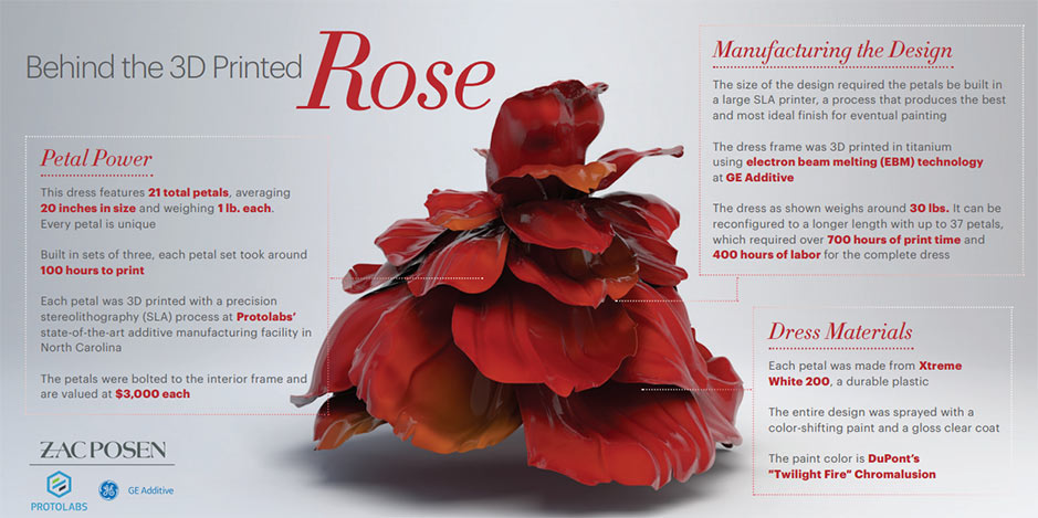 The petals on the rose gown worn by Dunn are made of Accura Xtreme White plastic. The titanium cage that fastened the petals are made of Ti-64.The bustier worn by Dobrev is made of Somos Watershed XC11122 plastic. The leaf collar accessory worn by Holmes is made of Accura 60 plastic. Garner’s headpiece is made of Nylon 12 plastic. And Padukone’s gown embroidery is made of Accura 5530 plastic. Protolabs’ proprietary MicroFine Green™ resin and nylon was also used.