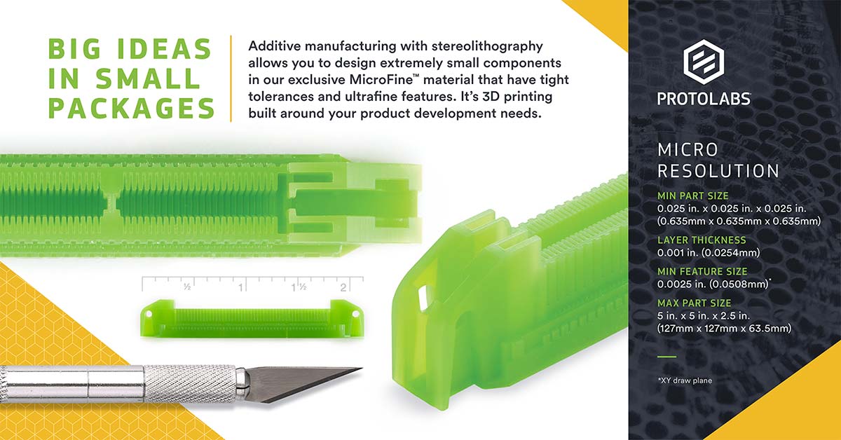 对于特征尺寸非常小的时候,例如0.0025英寸。,我们提供微分辨率。我们可以通过独家材料MicroFine™实现这些超细功能。这种热固性树脂制造零件的尺寸为0.001英寸。层。马克斯。零件尺寸为5英寸。5英寸。缩小了2.5英寸。,并提供非常严格的公差。MicroFine™内置的大多数部件不超过1英寸。 by 1 in. by 1 in.
