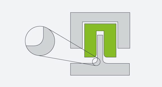 通过注射成2022世界杯足球赛时间表型,我们是流动熔融树脂通过腔。树脂不喜欢被逼到一个尖锐的角落——尤其是当它冷却和松弛的时候。半径有助于减少由尖角和气流突变造成的剪切和湍流。你身体部位的尖锐边缘自然会松弛,形成一个小半径,所以给它一些它想要反映的东西——一条曲线,而不是一个尖锐的角。为零件几何形状的内角添加半径对于帮助零件从模具中干净地弹出至关重要。