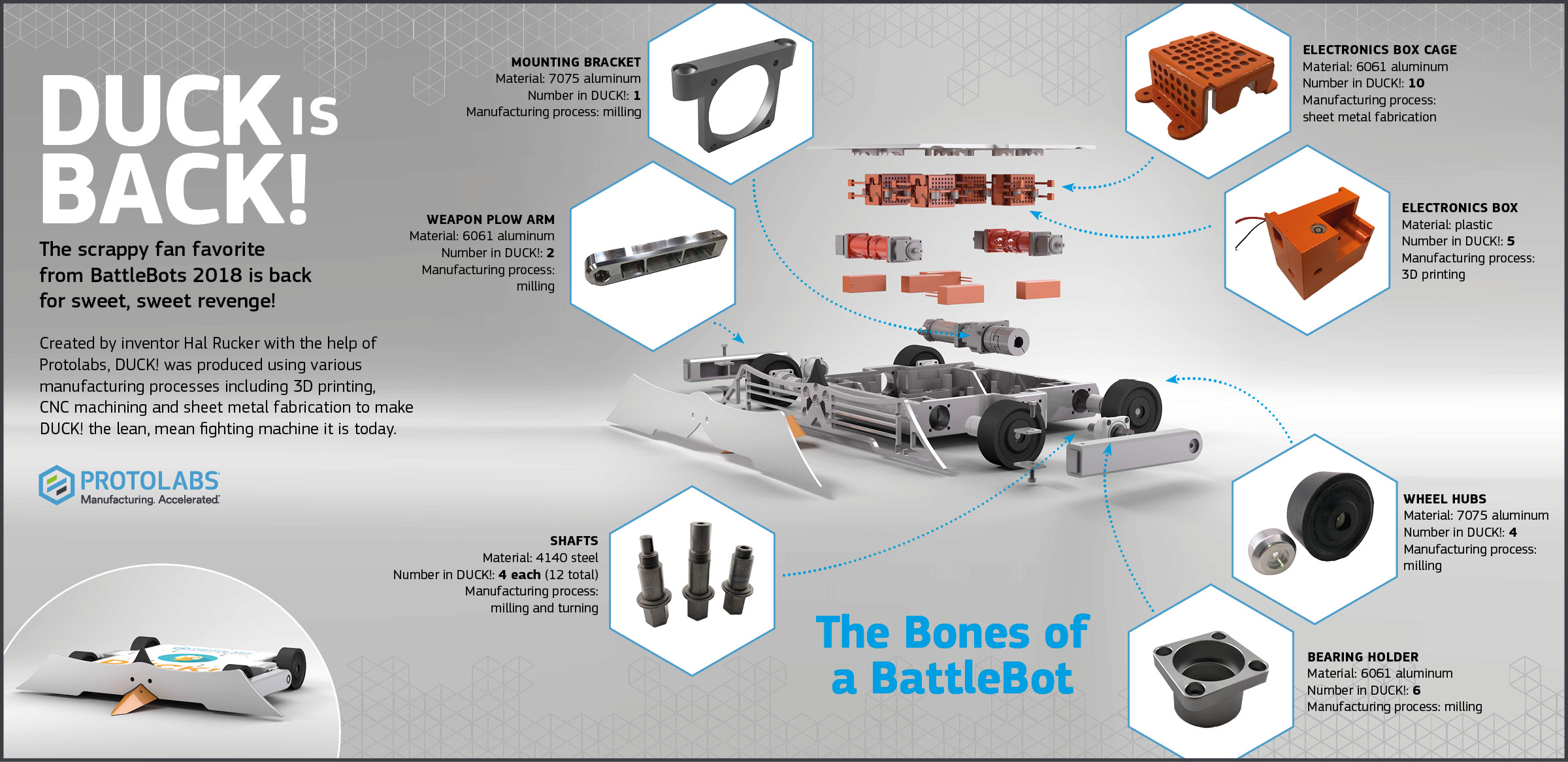 Protolabs was a fantastic partner last year, so naturally we asked them to sponsor DUCK! 2.0 this year. The build time is quite short, and our team is relatively small, so Protolabs has become essential to our ability to make a durable BattleBot quickly. Great parts. Always accurate. Super fast.