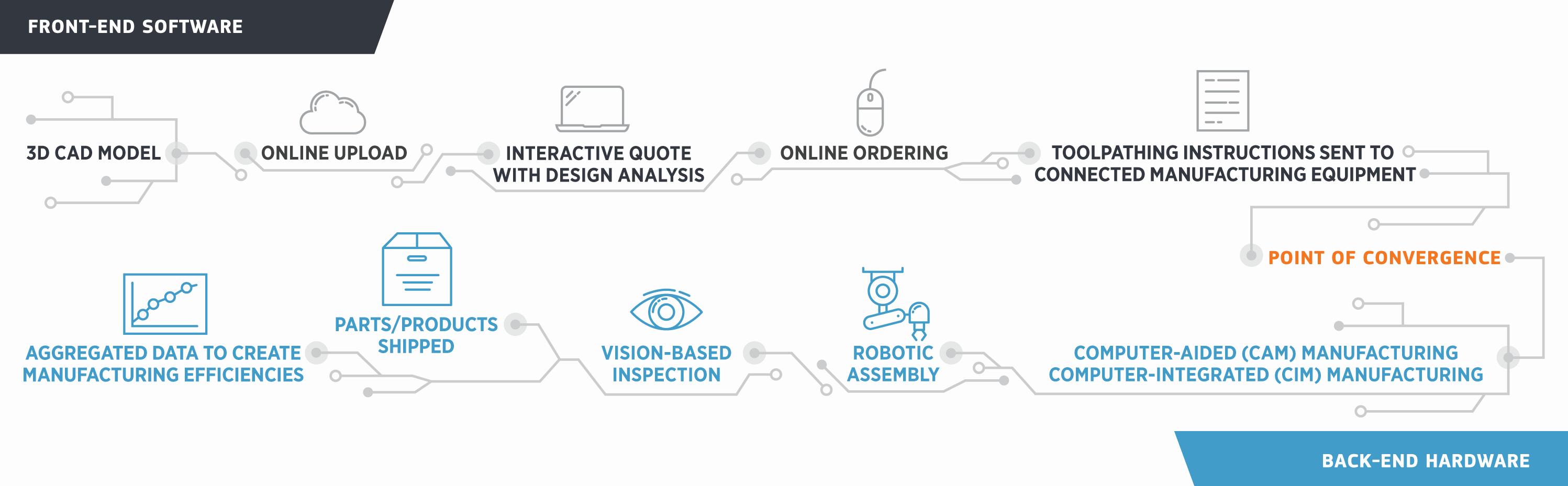 从那以后,Protolabs接受了这个最初的想法,并将其付诸实践。大约在2007年,该公司推出了快速回转数控加工业务,决定绕过公司基于erp的调度系统,采用具有数字制造意识的自主系统。2022世界杯附加赛决赛来自集成零件报价和工具路径系统的信息自动与生产车间共享,在生产车间,视频显示允许工人看到关于作业队列、安装要求、生产和质量指标的实时信息。同样,随着生产过程中的工作进度,状态信息被自动收集,然后反馈到MRP和库存控制系统。