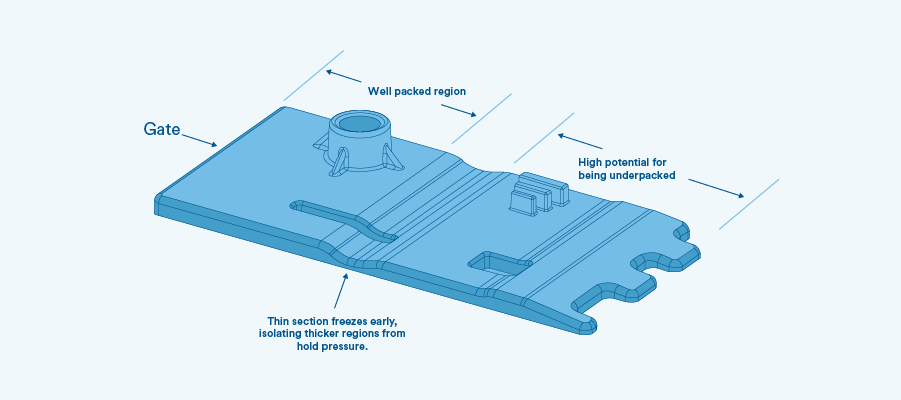 由于塑料一旦凝固就不能有效地传递压力,因此有效填充所需的时间与几何形状有关。如前所述,零件内的薄片比厚薄片结冰更快,并使区域免受填料压力的影响。