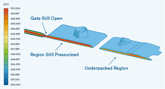 考虑到浇口通常比零件壁薄,浇口会在零件几何形状之前凝固。一旦浇口凝固,来自进料系统的零件腔的增压就完成了。